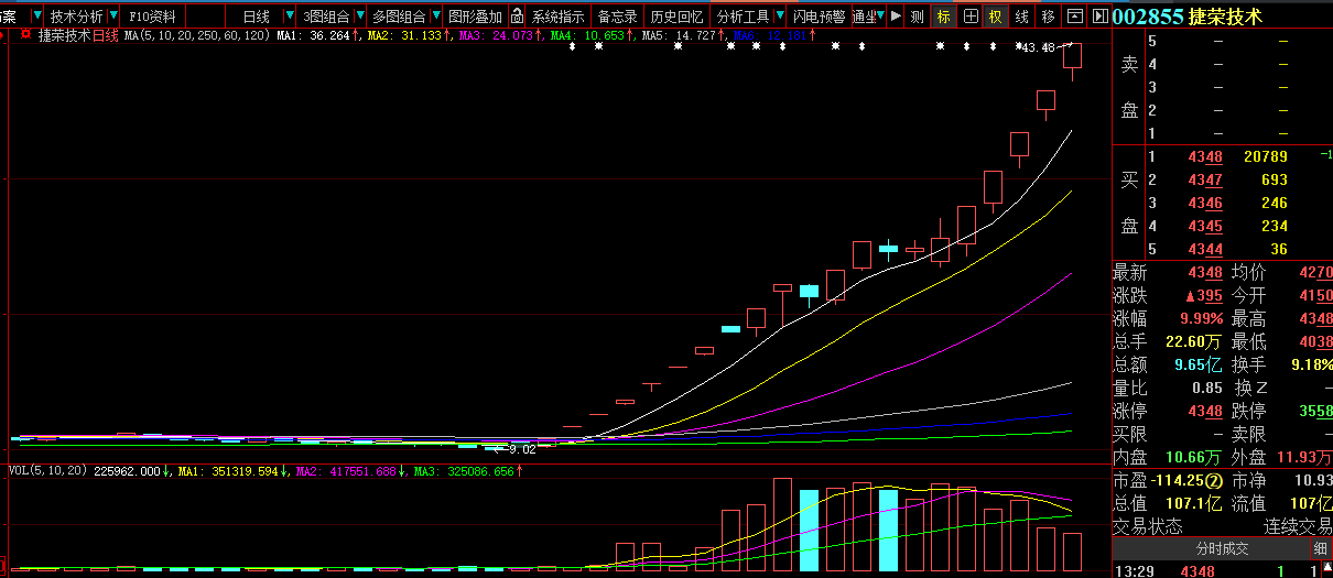 捷荣技术,8月30日开启了连续涨停模式,到今天为止的20个交易日,一共出现15个涨停板,阶段涨幅超过376%。