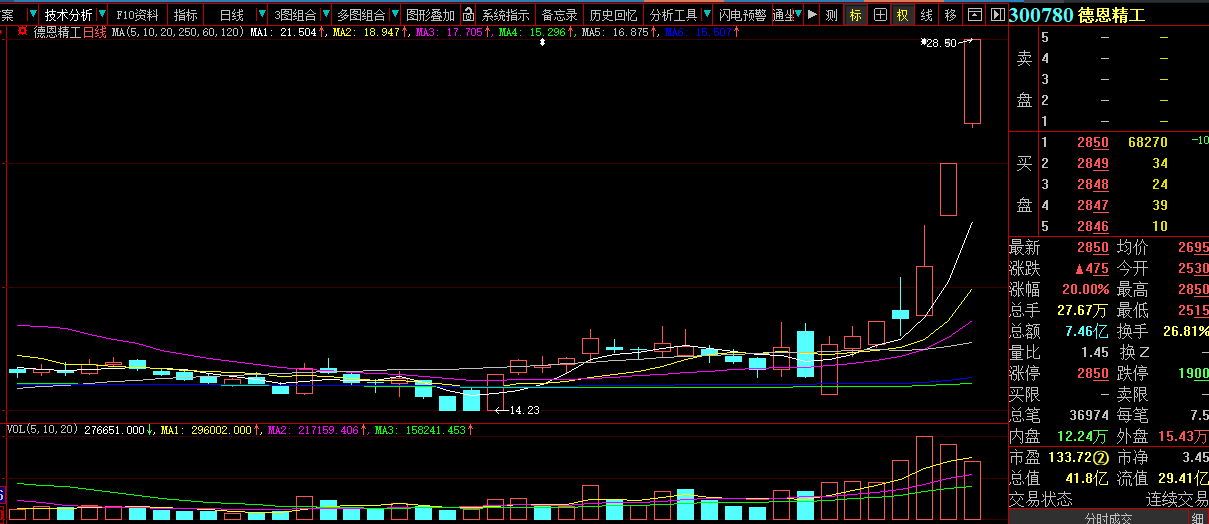再看另一只牛股,最近两天连续两个20CM涨停的德恩精工。德恩精工主要题材是机器人概念,公司是机械传动设备的零部件制造商。