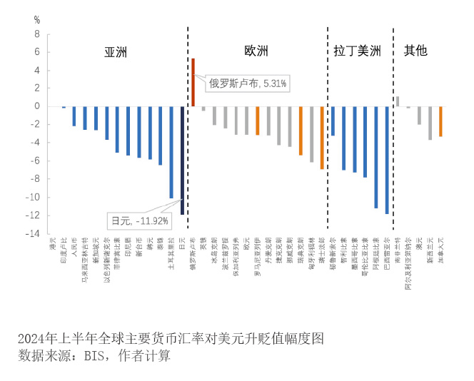 2024年上半年,美元震荡走升。美国劳动力市场和通胀水平屡超预期,强势的经济数据使得美联储降息预期一再降温,加上地缘政治风险和避险情绪高企,使得美元指数(USDX)在101.3106.4的较强区间内震荡上行,上半年温和升值4.4%。在美元总体上行趋势下,多数非美货币走弱。根据美联储公布的美元指数,2024年上半年美元对主要贸易伙伴货币升值4.8%,其中对发达经济体货币升值4.5%,对新兴经济体货币升值5.2%。