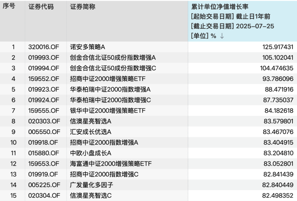 截至7月25日,在主动量化产品中,诺安多策略A近一年累计单位净值增长率超120%,信澳星亮智选A/C、广发量化多因子、中欧小盘成长A近一年涨幅均在80%以上。在量化指增产品中,创金合信北证50成份指数增强A/C近一年涨幅超100%,招商中证2000增强策略ETF近一年涨幅超90%,跟踪中证2000指数、中证1000指数的产品表现普遍超过沪深300指数挂钩产品,小市值风格明显占优。