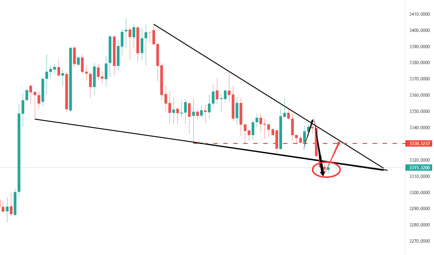 如果要跟踪破位后续跌,那今天的交易方式就很简单,等待反弹3323或者3330做空就好了,直到它跟这个三角性底沿彻底拉开距离为止,因为临近趋势线,难免也会有一些反抽摇摆动作,也不是没有再度收复回归的可能,也就是所谓的反转,所以这期间仍然还是要谨慎交易,不能太过于懈怠,因为这种三角行末端的破位方向很难直接界定,上下扫完之后再走出来的太多了,你要说直接一波就能决定胜局,我不说没可能,只能说你太有信心。