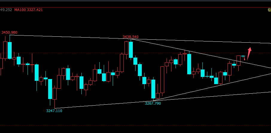后市,日线三角收敛震荡区间被突破,价格强势,思路上还需回踩三角收敛趋势线区间支撑,依托此区间低多,止损3365,止盈看3408,站稳3408或突破3408,有望冲击3425-30压制,值得关注。
