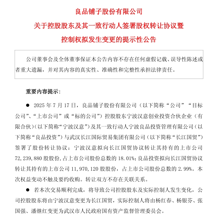 7月17日,零食巨头良品铺子(603719.SH,股价13.71元,市值54.98亿元)公告称,公司控股股东宁波汉意及其一致行动人良品投资与武汉长江国际贸易集团有限公司签署了股份转让协议。国贸转让其持有的上市公司7223.99万股股份,占上市公司股份总数的18.01%;良品投资拟国贸转让其持有的上市公司1197.01万股股份,占上市公司股份总数的2.99%。公告称,