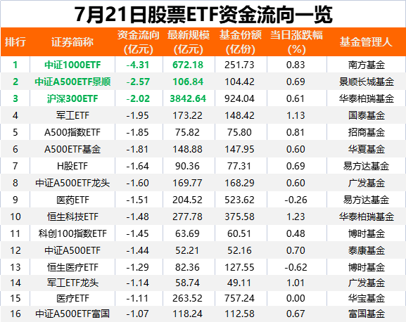 从单只产品看,南方基金旗下中证1000ETF基金单日净流出资金超4亿元,位居股票ETF首位;中证A500ETF景顺单日净流出2.57亿元,位居第二;华泰柏瑞基金旗下沪深300ETF昨日净流出资金也超2亿元。
