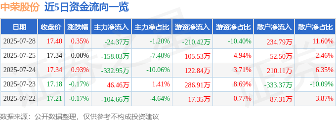 证券之星消息,截至2025年7月28日收盘,中荣股份(301223)报收于17.4元,上涨0.35%,换手率1.04%,成交量1.17万手,成交额2023.5万元。