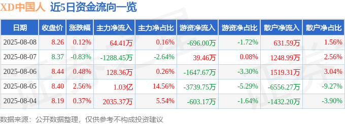 证券之星消息,截至2025年8月8日收盘,XD中国人(601319)报收于8.26元,上涨0.12%,换手率0.14%,成交量48.88万手,成交额4.04亿元。
