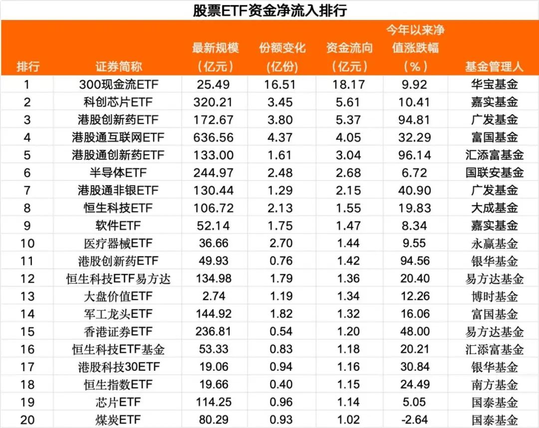 Wind数据显示,资金净流入前20大股票ETF中,港股相关ETF有11只,涉及创新药、互联网、科技、非银等方向;行业主题方面,半导体芯片相关ETF有3只,软件、军工、煤炭,以及大盘价值等相关ETF各有1只。