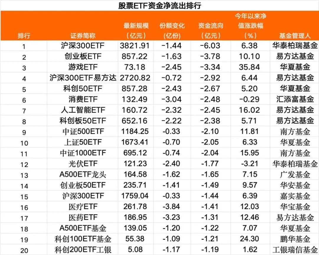 8月8日,“失血”金额超过1亿元的股票ETF有24只。其中,跟踪沪深300、创业板、科创50等宽基指数的ETF,以及游戏、消费、人工智能等行业ETF“失血”金额靠前。