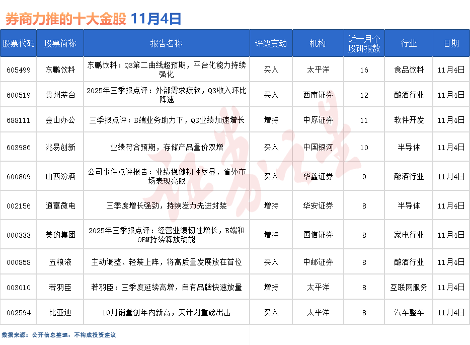 东鹏饮料最受券商关注,近一个月获中国银河、第一创业、开源证券、中邮证券、群益证券、万联证券、西南证券等16份券商研报关注,位居11月4日券商力推股榜首。