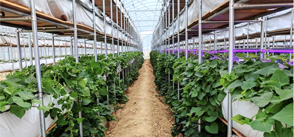 阳光下,厦门市同安区洪塘镇三忠村的立体蔬菜大棚里,藤蔓攀满支架,地瓜静待丰收。