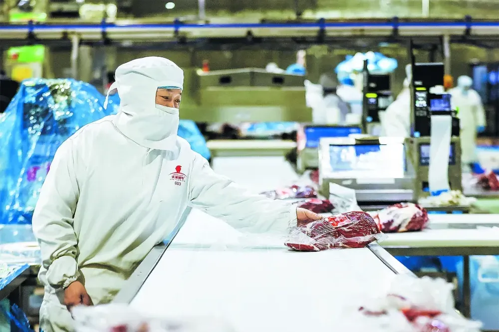 新疆天莱香牛食品有限责任公司生产车间,员工在流水线上作业 (博尔塔拉融媒体中心供图)