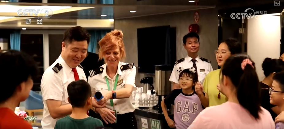 为了迎接暑期出游热潮,这艘游轮新增了文化体验活动。活动室内,一位外籍工作人员正在和小朋友们进行英文口语对话练习,边赏三峡夜景边寓教于乐。