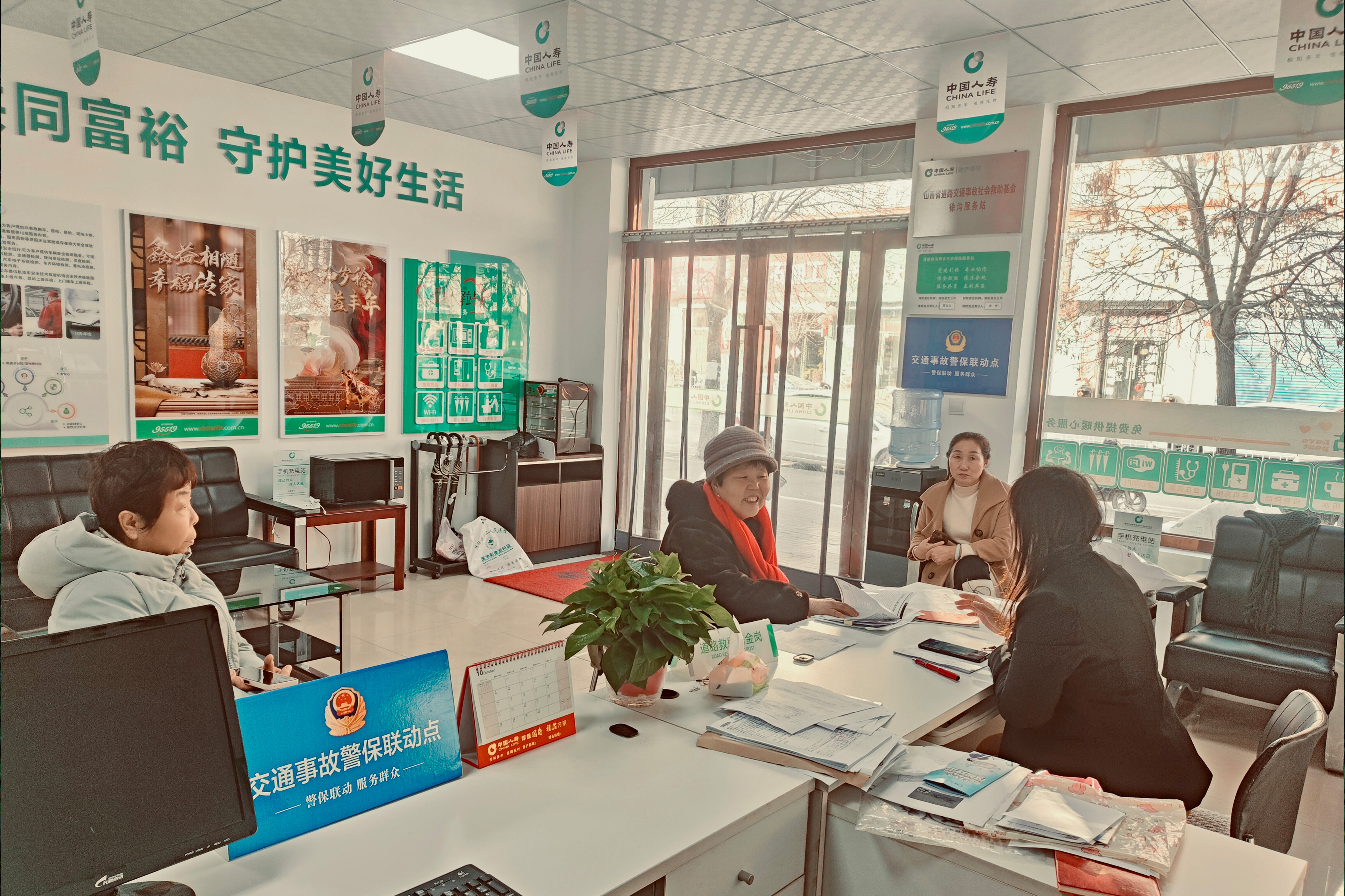 别看徐沟镇这间小小站点仅有25平米的店面,服务范围却覆盖了周边4个乡镇约6万人口。这里也布置得明亮、温馨,除了可以来咨询、办理健康险、养老险、家财险、车险、农险等业务,可以咨询中国人寿集团成员单位广发银行的银行业务,站内还给免费提供WiFi、手机充电、续热水、借雨伞、微波炉热饭等便民服务,因此这里也成了环卫工人和快递小哥们的暖心歇脚点。